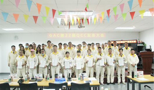 11月17日,GAC第22屆QCC決賽在三工廠二號培訓(xùn)室如期召開。發(fā)表前的亮相環(huán)節(jié),各小組都各出奇招,展示了各具特色的精神面貌,以爭取各評委的青睞與加分。其中,青春靚麗的90后小組和三句半的起點小組,都發(fā)揮出了別具一格的青春活力,給發(fā)表會場的開頭,帶來了活躍的氣氛。